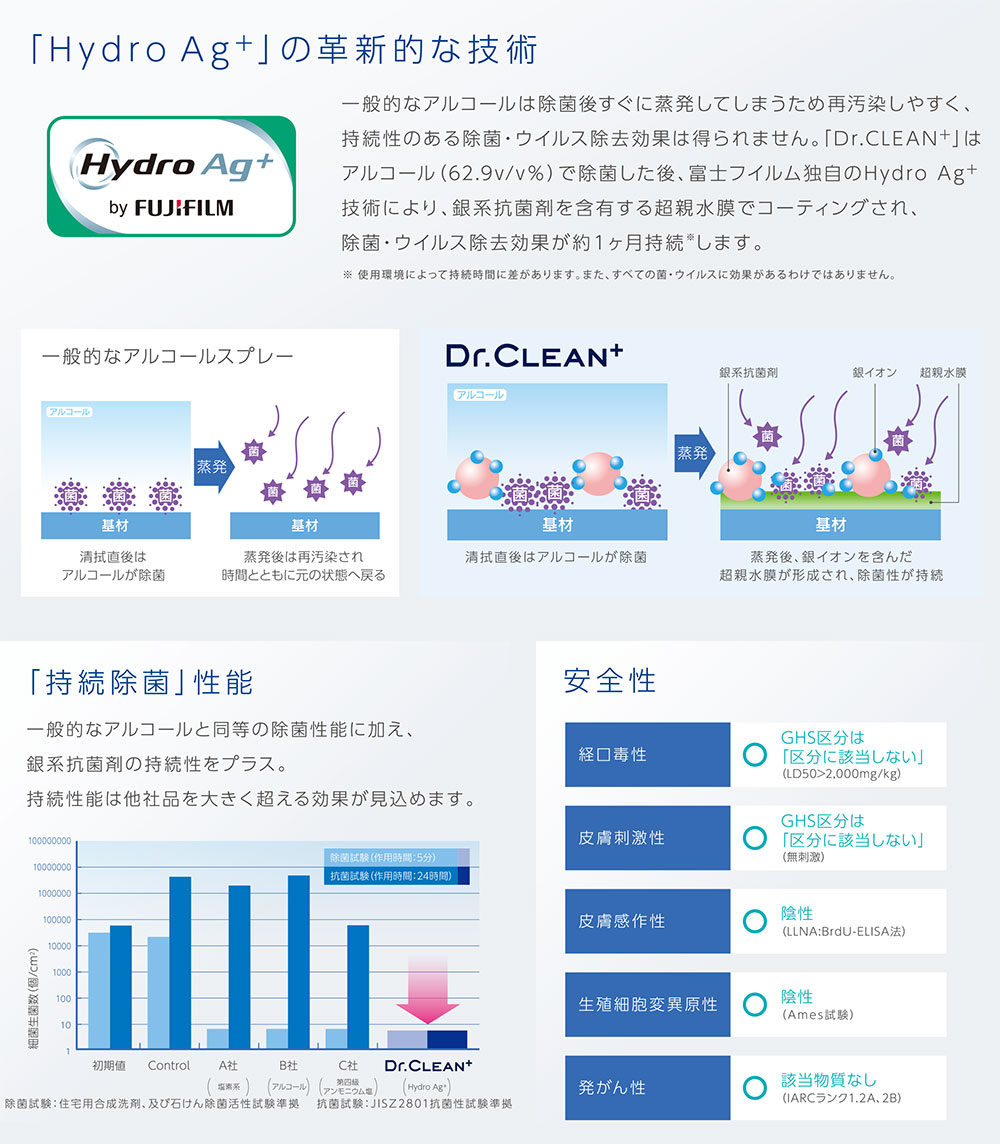 1日1回で持続する除菌効果医療現場で使われる信頼と技術 富士フイルム独自のHydro Ag+技術により、銀系抗菌剤を含有する超親水膜でコーティング除菌・ウイルス除去効果が約1ヵ月
