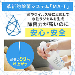 (MA-Tは腐食性・刺激性が水と同じレベルの高い安全性を保ちながら、優れた除菌力と消臭効果を両立させた無色、無臭、無刺激性の水溶液です。)